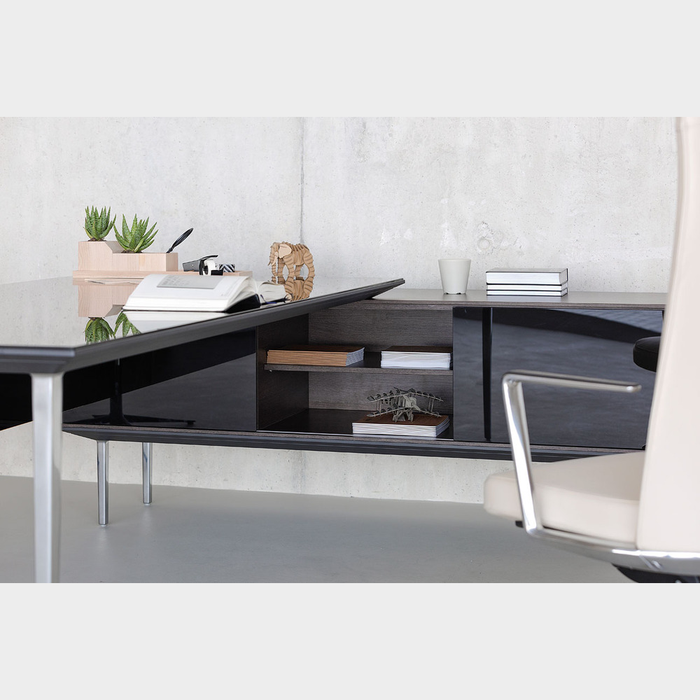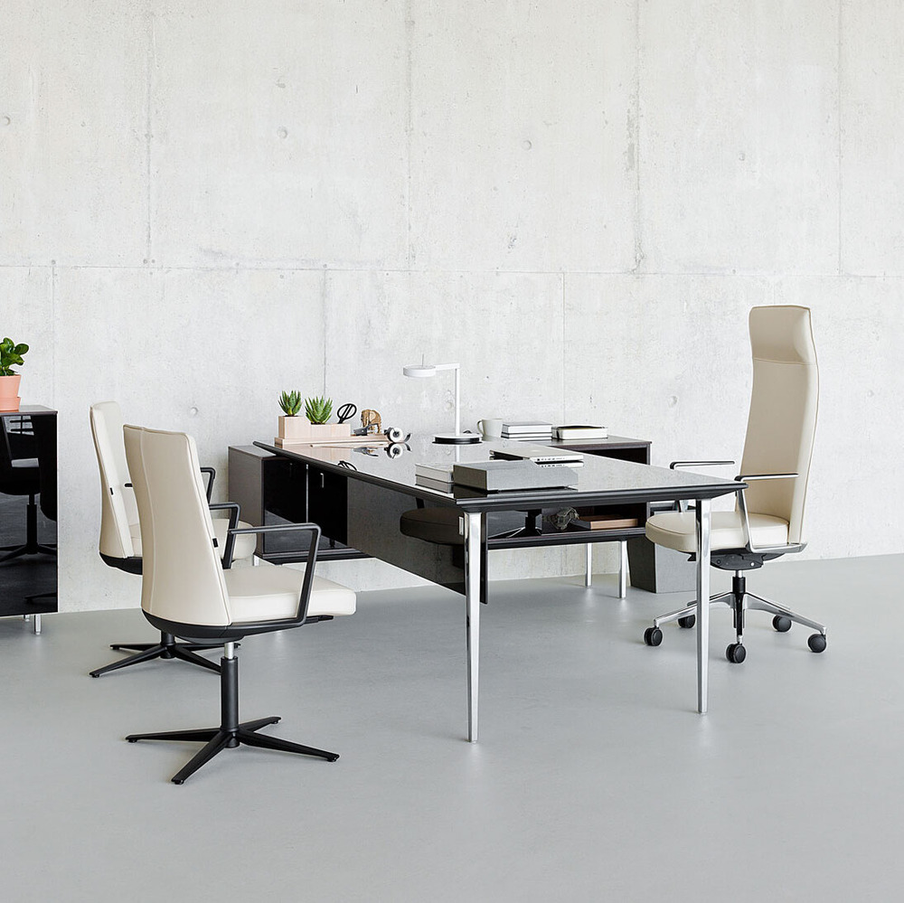 The desks from the Longo collection allow you to create a stylish space in the executive area in your office, which is also very comfortable. The design of the Longo desk makes it seem visually weightless in the different settings where it can be placed: in an office, as a work desk, in a meeting room. As part of a modular system range, LONGO desks can maintain a unified visual concept in your space. High quality meeting room tables designed by Ramos & Bassols, specially crafted to create dynamic meeting rooms.