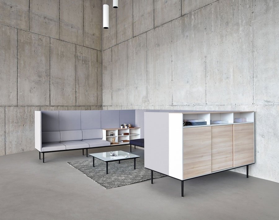 Longo is a modular system consisting of sofas, operative and managerial desks, with storage solutions (cabinets, libraries), accessories and sound absorbing panels.