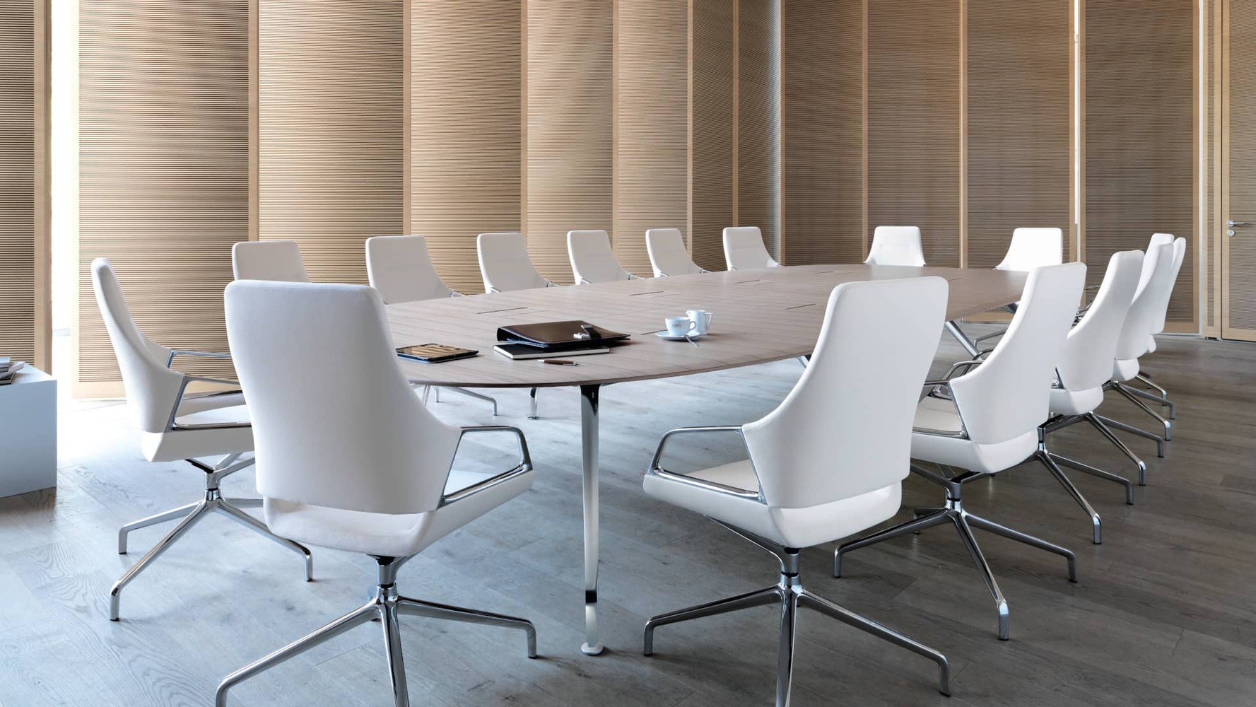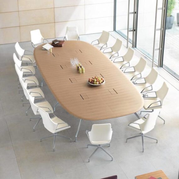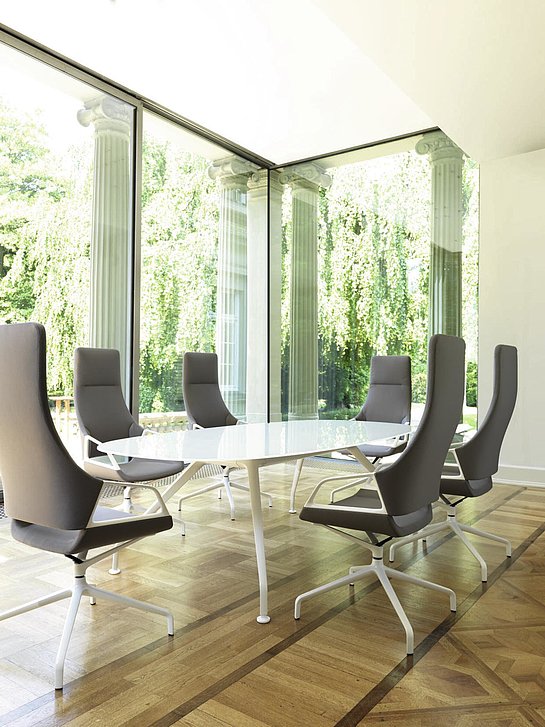 Designed for modern meeting spaces, the table allows for discreet integration of multimedia equipment, with optional electronic ports for convenience. Available in bright chrome, matte polished chrome, or black/white finishes, alongside various tabletop materials—including soft-touch wood veneers in white, black, or natural finishes—the Wilkhahn Conference Table offers exceptional flexibility for diverse interior design concepts.