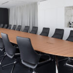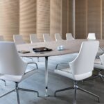 Designed for modern meeting spaces, the table allows for discreet integration of multimedia equipment, with optional electronic ports for convenience. Available in bright chrome, matte polished chrome, or black/white finishes, alongside various tabletop materials—including soft-touch wood veneers in white, black, or natural finishes—the Wilkhahn Conference Table offers exceptional flexibility for diverse interior design concepts.