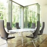 The Graph line features a cohesive design, including chairs that complement the table’s aesthetic. Its sloping die-cast aluminum legs mirror the aluminum underframe, creating a continuous light line that enhances the table’s seamless appearance. The table’s asymmetrically curved edges and rounded corners contribute to its elegant, almost gravity-defying look, with options for round, compact, and long oval shapes.