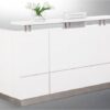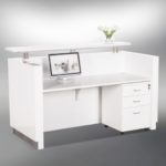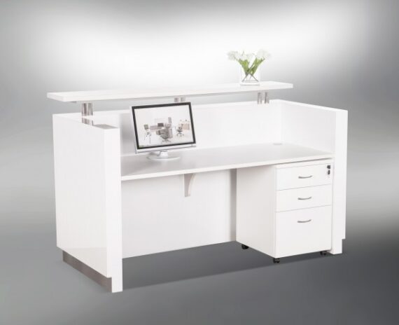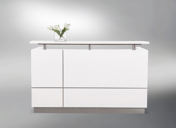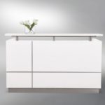 Clean modern lines with style and functionality. Quality materials and fittings. Counter body in gloss white with feature aluminium strips. Matt white desk top, jade white stone hob and stainless steel kick plate. Option of 1800mmm or 2200mm wide