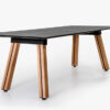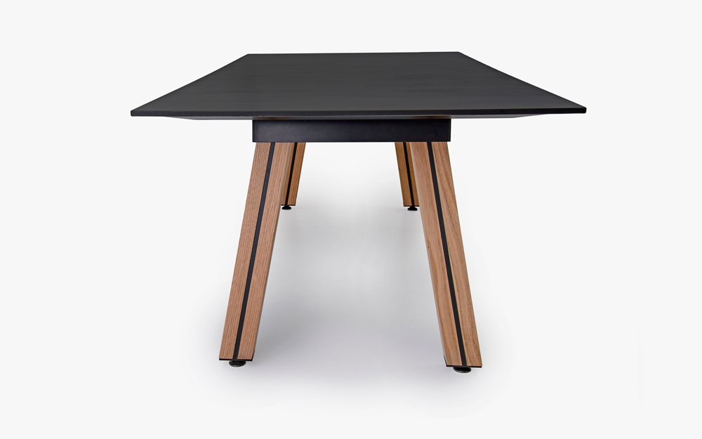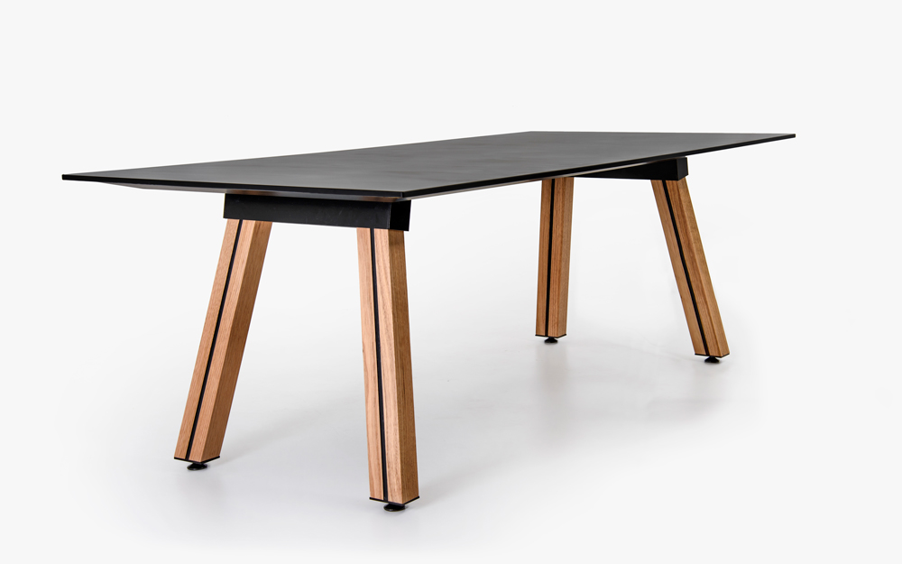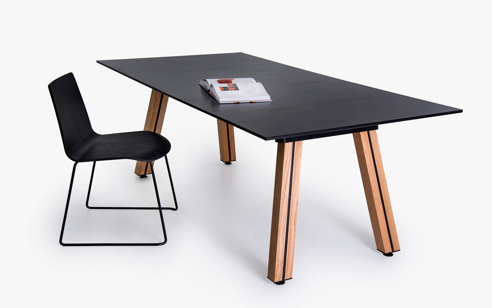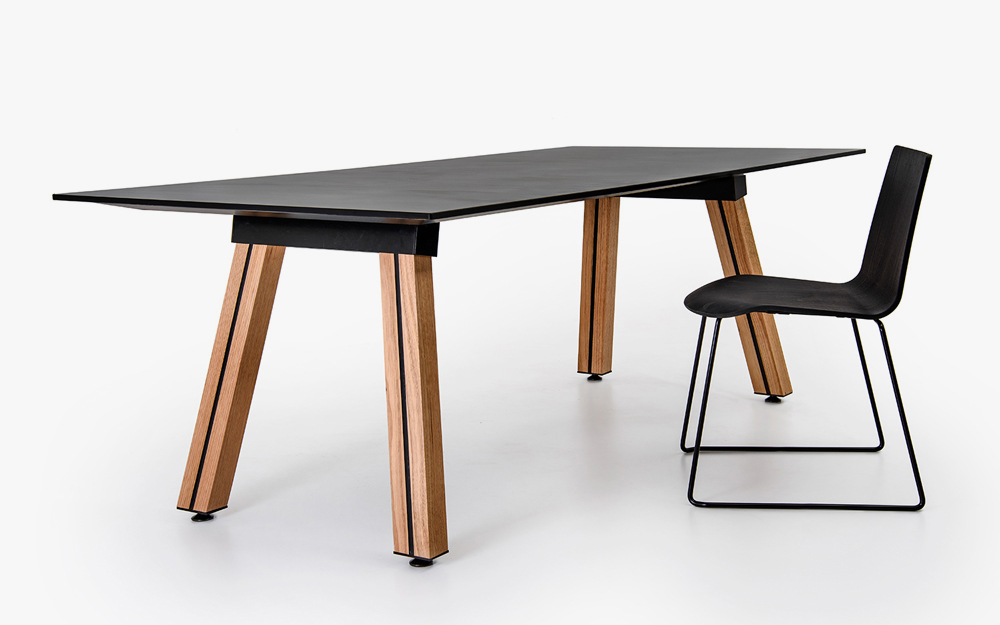 The Aqua table uses bold lines to draw attention upwards from the timber legs towards the contrasting top. Aqua looks and feels robust but maintains an air of elegance with soft angles to counter rigid corners.