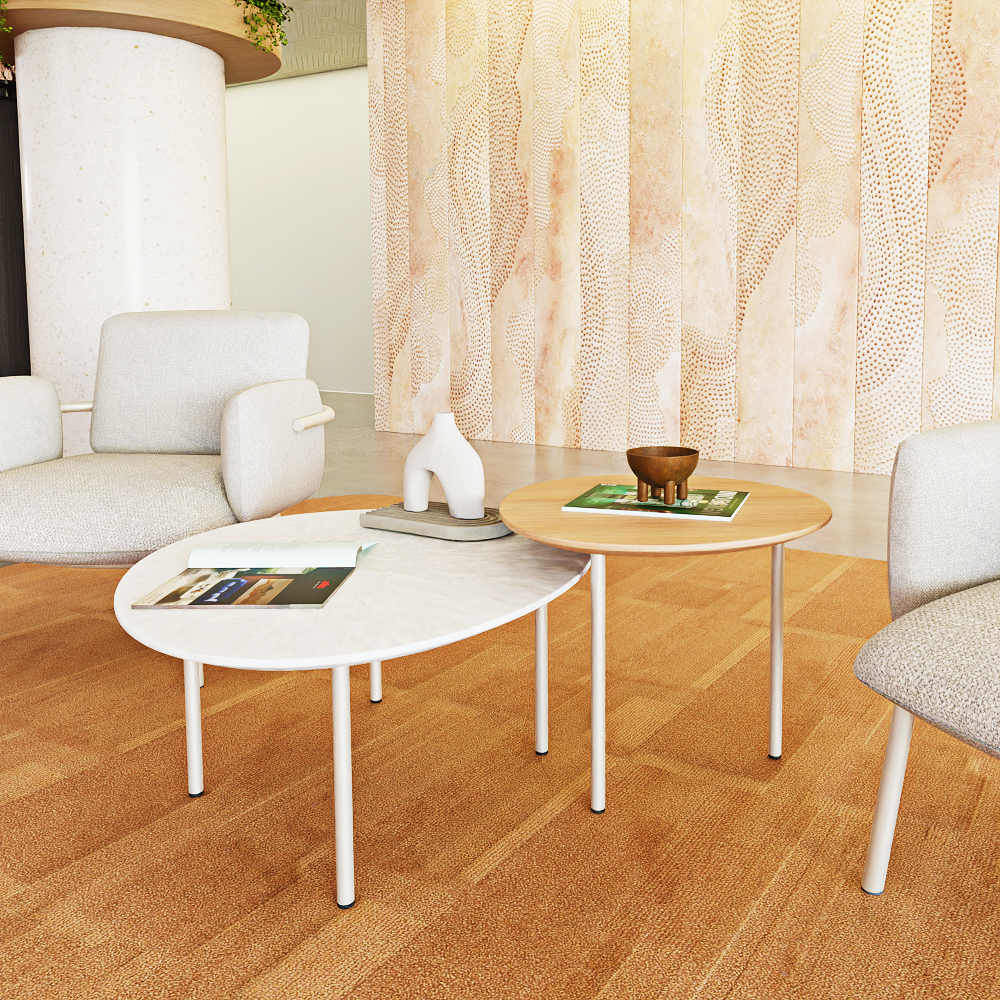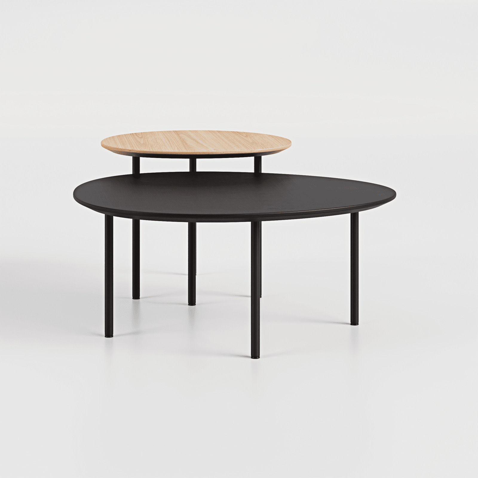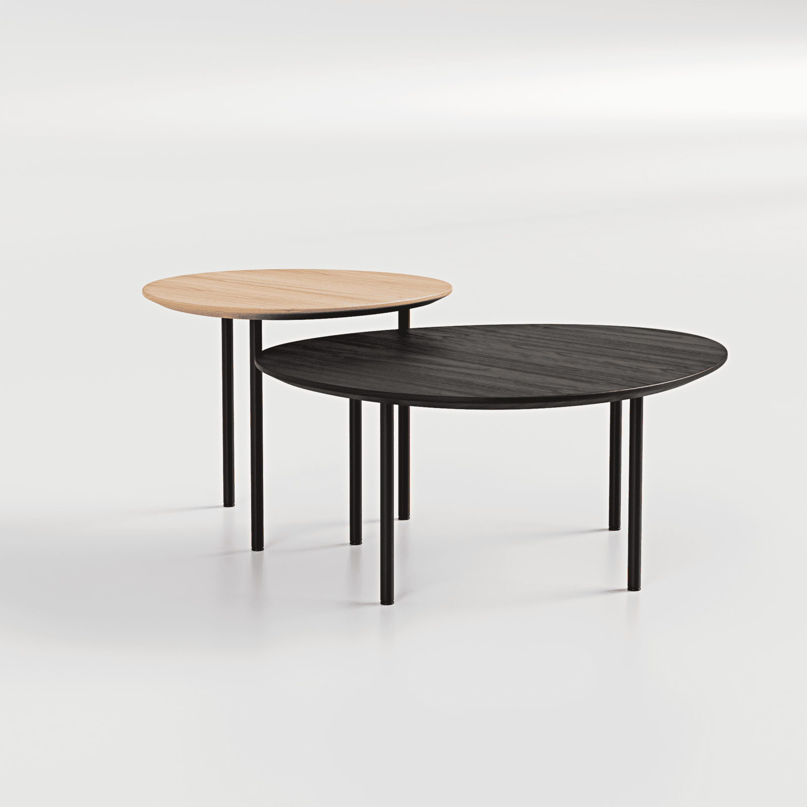 The Lotus coffee table draws inspiration from the organic shapes found in nature, specifically the layered structure of a lotus leaf. This design evokes the serene beauty of summer landscapes. The table features an array of shapes, sizes, and heights, with larger tables seamlessly nesting beneath smaller ones, creating a visual effect reminiscent of a natural eclipse.