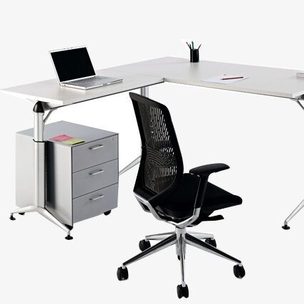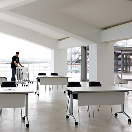 Comfortable and functional piling system.Trama is available with height adjustable legs to increase dynamism and ergonomics.For shared, dynamic spaces, TRAMA has a cyclindrical column, made of steel. It is a mobile unit with wheels, making it a bold and functional piece.