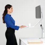 QuickStand Lite features an innovative counterbalance mechanism that enables users of varying heights to transition from sitting to standing positions with ease, offering 20” of total height range and an added 5.5” of vertical monitor adjustment. Its effortless functionality encourages users to be active throughout the day.
