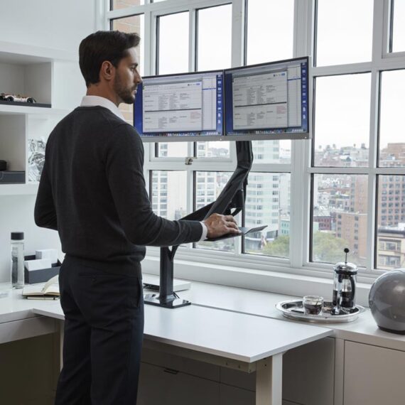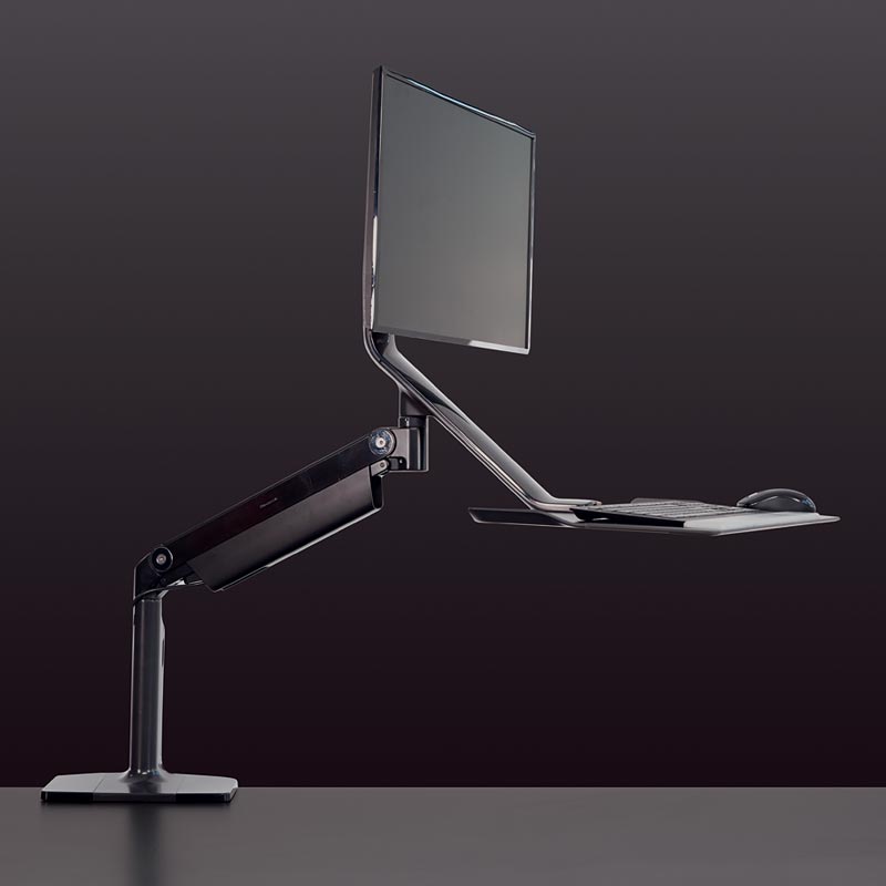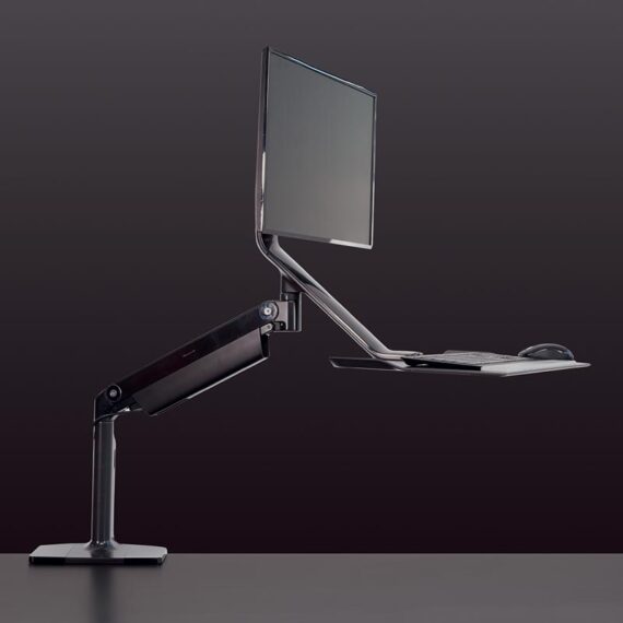 QuickStand Lite’s adjustable keyboard and monitor arm platform provides exceptional stability while typing. The main assembly holds single or dual monitors up to 25 lbs. and can be converted to either configuration with minimal tools and components.