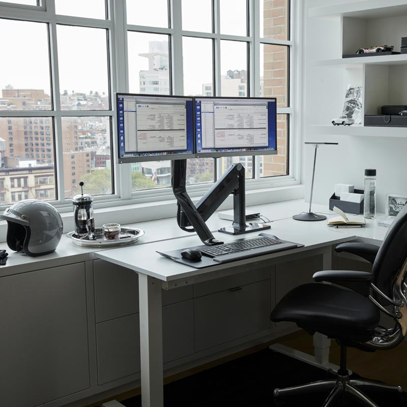 QuickStand Lite is a sleek, highly adaptable workspace tool suitable for collaborative and hot-desking environments, as well as home offices. Its minimalist aesthetic complements any interior and supports a variety of hardware. Its effortless functionality encourages users to build more movement into their daily routine for long-term health.
