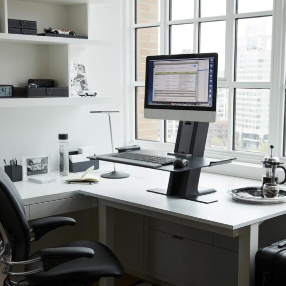 QuickStand features an innovative counterbalance mechanism that enables users with fixed-height computer desks to transition from sitting to standing positions with ease. Its effortless functionality encourages users to be active and integrate movement into their days, which is vital for health.